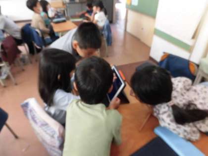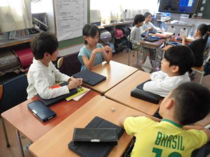学習用タブレット端末を使って、国語科の話し合いを行っています。タブレットに入力したことのみを見せるのではなく、伝えたい事柄をどのような表現で伝えるか、ということが大切です。