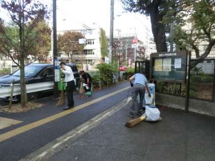 子どもたちの登校前、正門では、池尻小学校の主事さんと近隣の会社の方々が掃除をしていました。