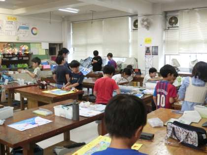 2組の授業は図工です。「へんてこ山」に色や模様をつけています。一人ひとりオリジナルな楽しい山が出来上がっています。子どもたちが考えることは、大人では思いつかないようなことばかりです。