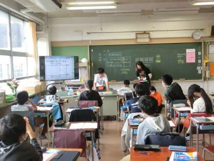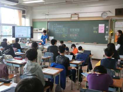 コーヒーとミルクで同じ濃さのコーヒー牛乳をつくろうという問題です。子どもたちは、みんなの前で自分の考えを発表しています。