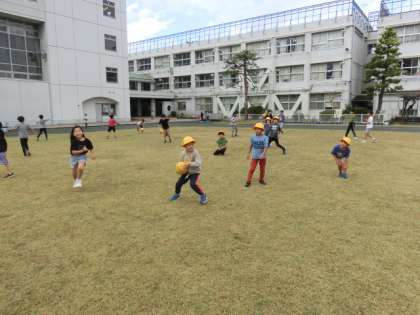 雨が降ったため、芝が濡れ、ボール遊びをしている人たちは、「ボールがすべる」と、声をあげていました。