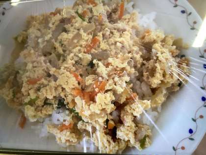 給食の親子丼は衛生管理のため、しっかりと加熱しています。人参・玉ねぎ・糸蒟蒻・三つ葉などを入れた具沢山の親子丼です