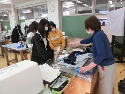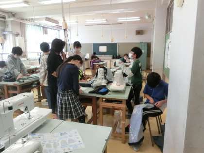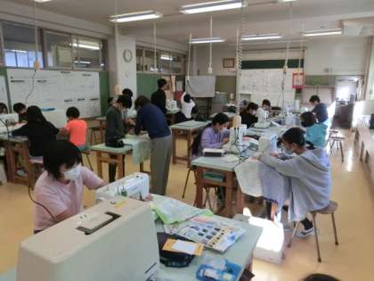 6年生の授業は家庭科です。エプロンを作っています。アイロンを使って、折り目をつけたり、仮止めを手縫いしたり、ミシンを使って縫ったりしています。折り目ぎりぎりに真っすぐにきれいに縫っている人がいて、とても感心しました。わたしでは、そこまでできそうにありません。