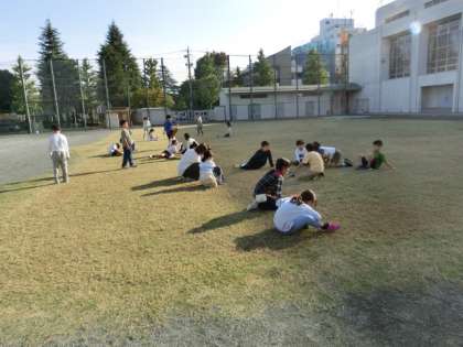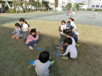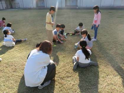子どもたちが一人ひとり鏡を持って校庭に出てきました。太陽の光を反射させています。はじめは、体育館の壁に光を反射させて動かして遊んでいましたが、次第に光を連結させたり、反射の線をリレーのようにつなぎ始めたりしました。