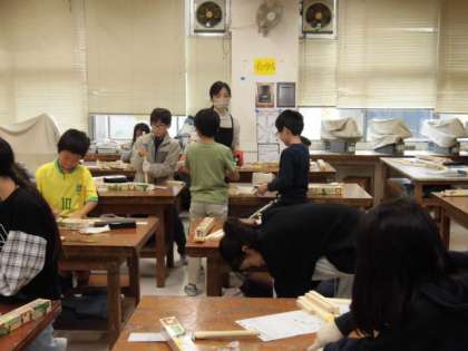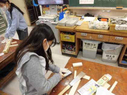図工の学習では、用具を使って木で顔を作ります。まずは、作りたい顔を絵に描き、木片を加工していきます。友たちと相談しながら、楽しそうに取り組んでいます。