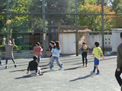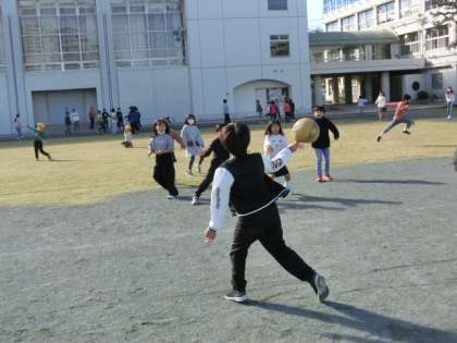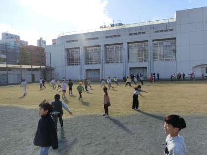 朝はとても寒かったのですが、昼になるとお日様がでてきて、とてもあたたかくなりました。子どもたちが校庭で遊んでいます。男の子と女の子も混じって、ボールで遊んでいます。