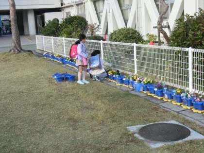 自分が育てている花に水をあげている人たちがいます。植物に気持ちが向いている姿を見ると、あたたかい気持ちになります。