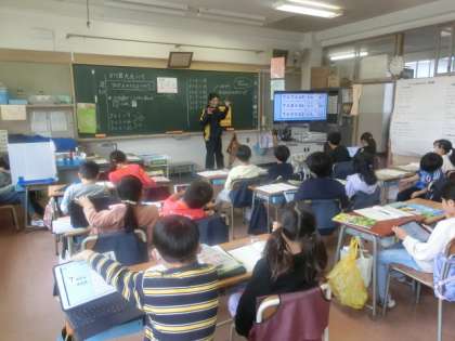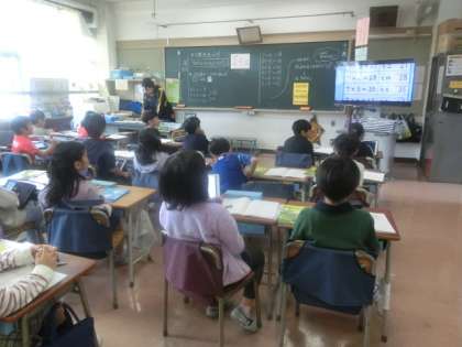 2組の授業は算数です。かけ算九九の学習です。7の段の学習をしていました。わたしも小学生のころ、7の段で苦労したことを覚えています。言い間違いが覚え間違いを生みます。先生は、言い間違いをして覚えないように、確認をしながら進めていました。