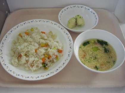 アスパラピラフ 牛乳 チーズのふわふわスープ パセリポテト