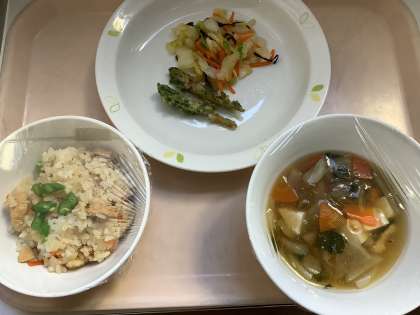 子ぎつねご飯・根菜汁・わかさぎの磯辺揚げ・白菜の塩昆布あえ