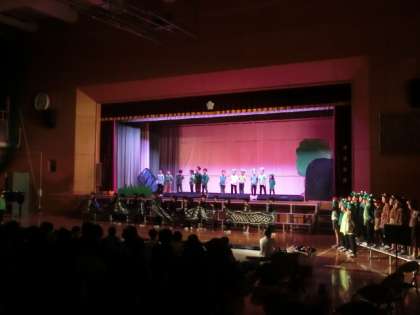 次は1年生の演技です。いろいろな動物になり切って、大きな声でセリフを言う1年生です。一生懸命に大きく動こうとしていることが伝わってきました。