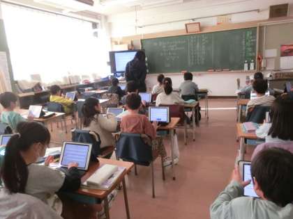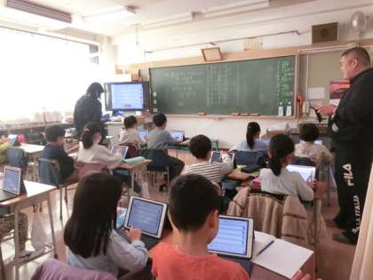 かけ算九九の確認のため、タブレットを使ってロイロノートのクイズ形式で早押し問題をやっています。九九は、すぐに答えを出せるようになる必要があります。