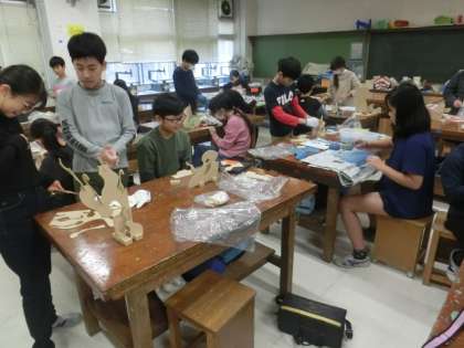 1組の授業は図工です。電動糸ノコで木板を切り、立体作品を作っていきます。糸ノコで細かいところまで切るのはとても大変ですが、子どもたちの作品を見てみると、きれいな曲線や細かい部品までていねいに切ることができています。