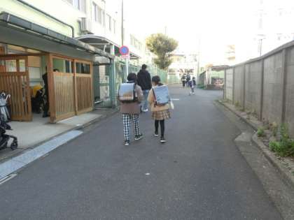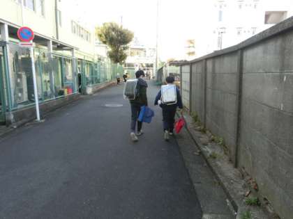 子どもたちが登校してきました。今日は日差しがあり、とてもあたたかい朝です。しかし、ピンク門の通りは、日陰になっていて少し肌寒く感じます。背を丸めて歩いている人が多く感じます。
