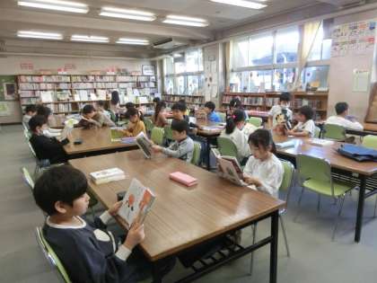 1組は図書室で読書をしていました。みんなとても静かに本を読んでいました。
