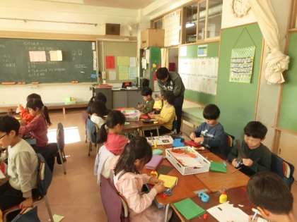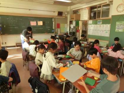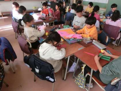 画用紙でパクパクのおもちゃを作っています。口の部分はできたようです。子どもたちは、目や鼻、そして、ひげなどの飾りをつけています。とても楽しそうです。