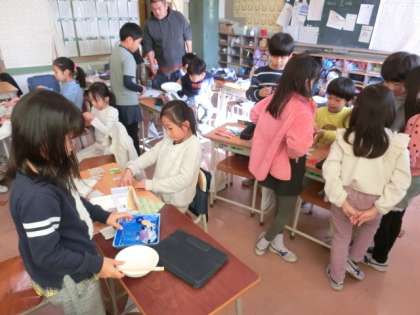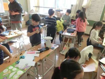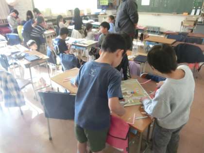 手作りのおもちゃを友達と協力して作っています。ストロー迷路やゴムを使った車などいろいろあります。子どもたちの作ったおもちゃからは、あたたかさが伝わってきます。