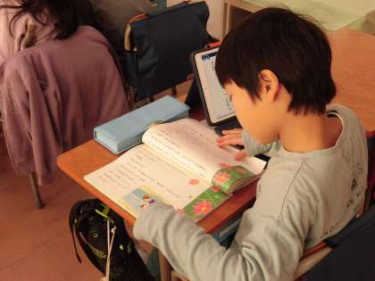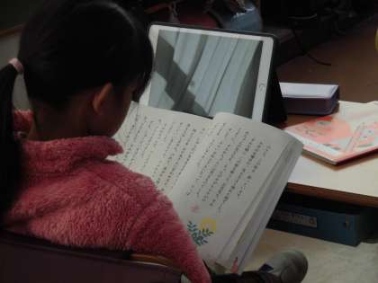 国語の物語文の学習です。全文を読み、1文でどのような内容かをまとめています。作品を何度も読み返しながら、言葉を選び、タブレットに入力しています。