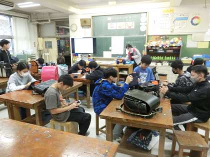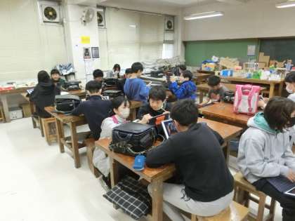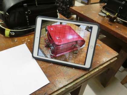 描きたい角度に自分のランドセルを置き、タブレットで写真を撮ります。その写真に縦横の補助線を入れて、描き始めの準備をしています。