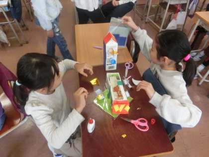 1組の授業は生活です。身の回りの物を使って作ったおもちゃで遊んでいます。