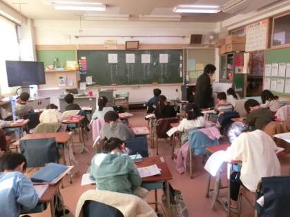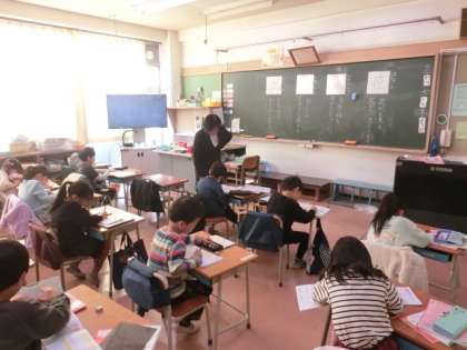 1組の授業は国語です。漢字の練習をしていました。ドリルに書き込んでいます。薄く書かれたお手本をなぞってから、自分で書きます。子どもたちは話はせずに集中して静かに練習を進めています。