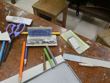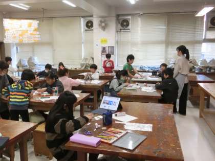 1組の授業は図工です。「ミニミニな世界」と題して、工作用紙で子どもたち一人ひとり思いついた好きな世界を作っています。