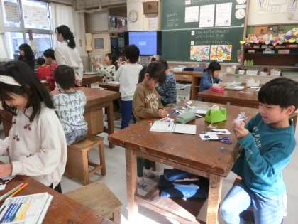 手足が動く人形を作ったり、餅つきをする人を作ったりしています。細かい作業ですが、子どもたちはとても楽しそうです。