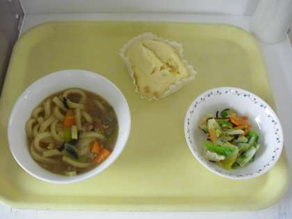 カレーうどん 牛乳 キャベツの塩こんぶかけ コーン入り蒸しパン
