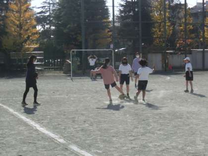 1組は体育の授業です。サッカーをやっています。6年生になると蹴る力が強く、ボールがすごい勢いでとんでいきます。男女まじって楽しそうにゲームをしていました。