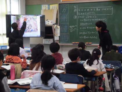 社会科では、玉川上水について学習しています。今日の学習めあては、「玉川上水の工事はどのように行われたか」です。資料を基に気が付いたことを発表しています。