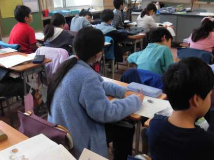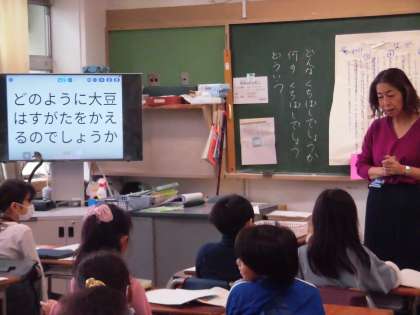 国語科 説明文「すがたをかえる大豆」の学習です。1、2年生のときに学んだ説明文の構成や話題提示などを振り返り、学習がスタートしています。