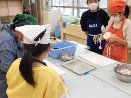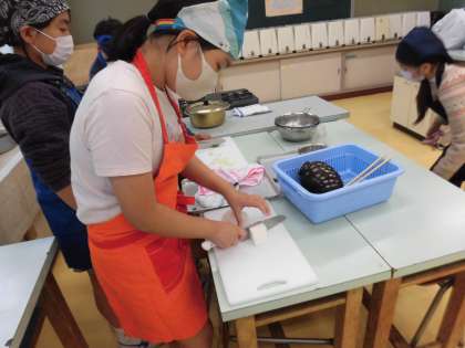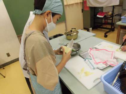 家庭科は、調理実習でお味噌汁を作りました。大根、油揚げ、ねぎのお味噌汁です。班のみんなで助け合いながら一つ一つの工程を進めています。