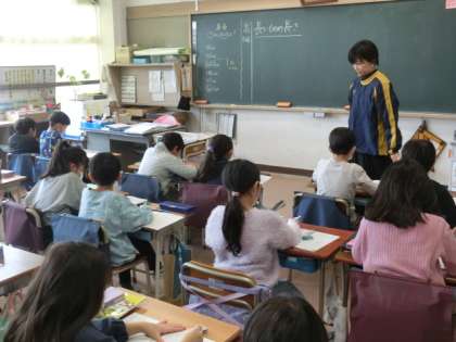 長いものの長さの学習です。子どもたちは単元名をノートに書き始めました。ノートに書く文字がとてもていねいです。筆圧がしっかりあり、堂々とした見やすい字がノートに書かれていました。授業が始まった直後でしたが、子どもたちのすてきに字を見て思わずほめてしまいました。