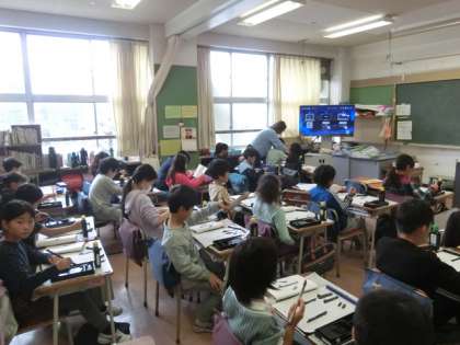 2組の授業は習字です。習字道具を用意し、墨汁を硯に入れていきます。入れる量も使い切る量を考えて入れています。書き始めると、子どもたちは静かになります。集中していることが伝わってきます。
