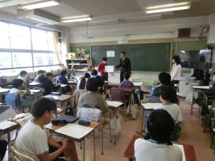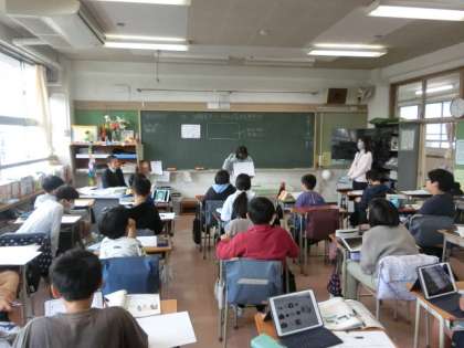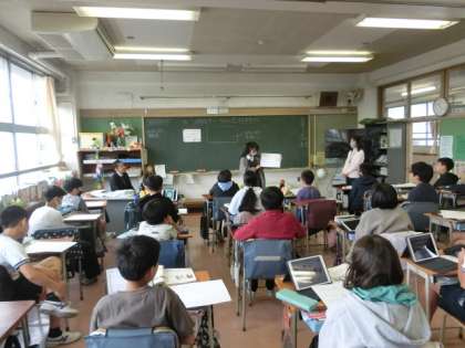 1組の授業は外国語です。英語支援員の先生もいらしています。小学校生活の思い出を紹介しています。日光のこと、学芸会のこと、運動会のことなど、子どもたちはそれぞれのベストメモリーを英文で紹介していました。