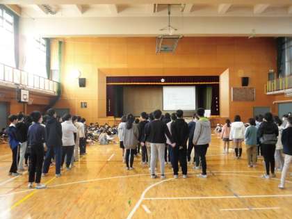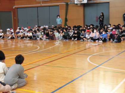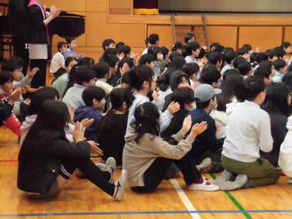 朝は、音楽集会です。6年生がお手本で歌ってくれます。さすが、6年生!「なべ なべ そこぬけ」を手をたたきながら歌い、その後、校歌を歌いました。