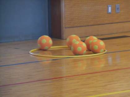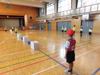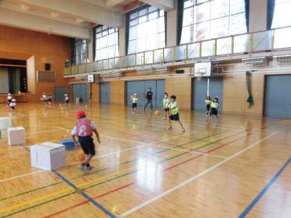 体育のボールゲームの様子です。自分たちで審判、ボール集め、試合中の声掛けをスムーズに行っています。