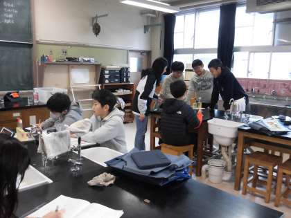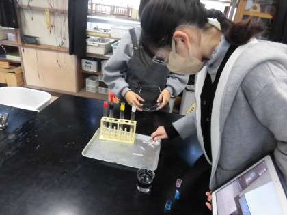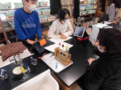 理科では、リトマス紙を使った実験です。4つの水溶液を分類しますが、班の中で記録や発表係など一人ひとりの役割を決めて取り組んでいます。