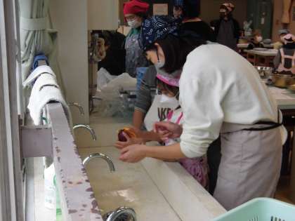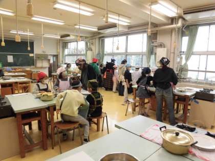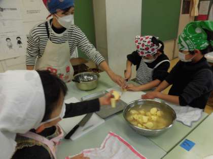 今日は、生活科で学級園にて2年生が育ててきたさつまいもを使った「おいもパーティー」です。包丁などを使うため、保護者の方々もお手伝いに来てくださいました。洗ったり、皮をむいたり、切ったり・・・楽しそうです。