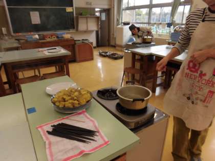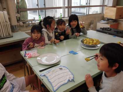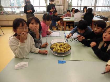 「おいもパーティー」のさつまいもは、保護者の方々が火を見てくださいました。ありがとうございます。絶妙の加減でふかし終わり、試食の開始です。