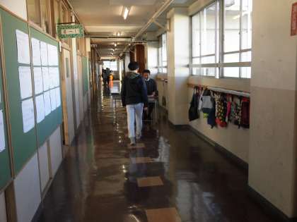 静かな廊下で一人ひとりに声を掛けながらあゆみを渡していました。待っている児童は、教室で別課題です。6年生は、冬休みが明けると池尻小で過ごすのもわずか3か月。みんなで過ごす大切な3か月です。