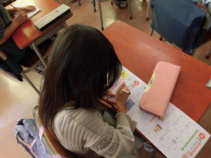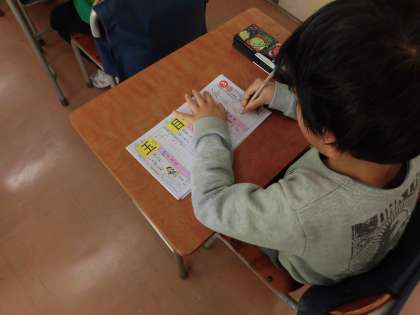 漢字の学習を進めています。書き順を確かめた後、漢字ドリルに集中して取り組みます。