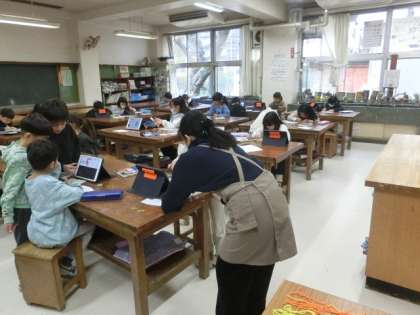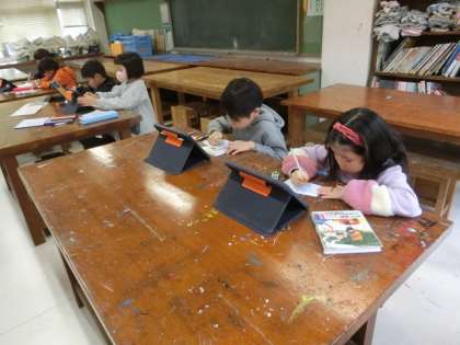 2組の授業は図工です。絵馬を作っています。タブレットで描きたい絵を選び、それを絵馬に描いています。回っていると、「見て、見て。」と、声をかけられます。とても楽しそうに活動しています。
