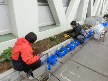 校庭を回っていると、主事さんが花壇の整備をしていました。パンジーの花壇の雑草を抜いているようです。こういう日々のお世話できれいな花が咲いているのですね。
