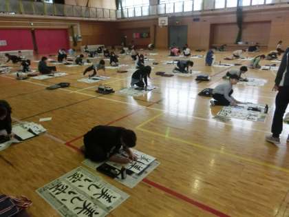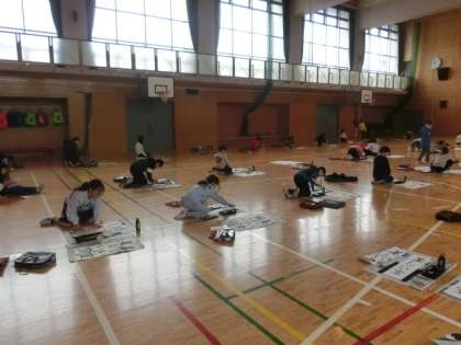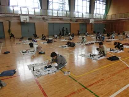 4年生は学年そろって体育館で、席書会を開いていました。新春の音楽がかすかに流れる中、子どもたちは集中して筆を動かします。出来上がったものを見ると、どれも力強く、しっかりとした文字ばかりです。集中していることが、文字にあらわれています。
