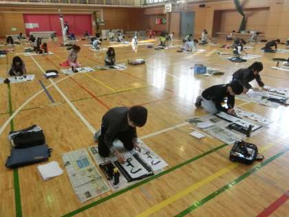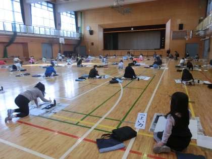 子どもたちは静かに筆を動かしています。ふざけている人は誰もいません。お正月の音楽だけが、体育館に響いています。出来上がりも楽しみですが、このようにみんなが気持ちを落ち着かせて取り組んでいることが、うれしいです。