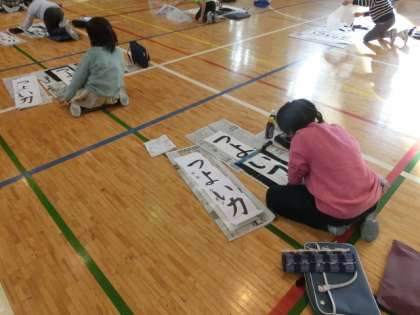 3年生は1組2組そろって、体育館で席書会を開いていました。