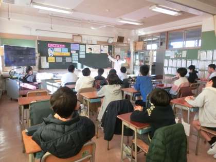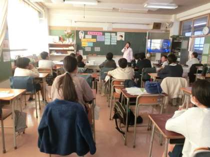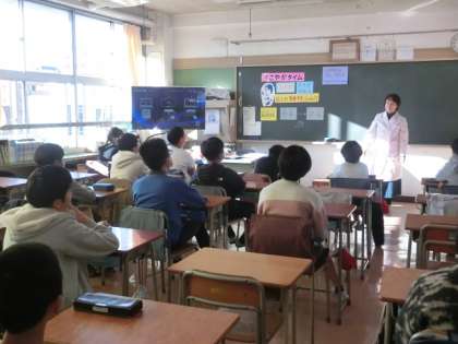 6年生の教室では、すこやかタイムが行われていました。養護の先生による保健指導と発育測定です。