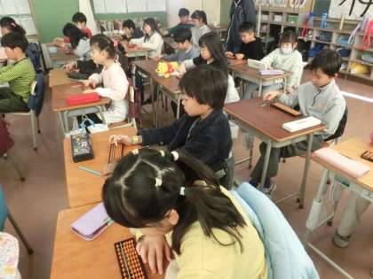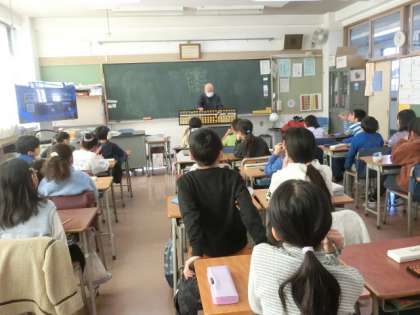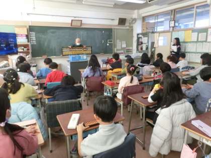 3年生の教室ではそろばんの学習をしていました。そろばん協会の方にゲストティーチャーとしていらしていただいています。