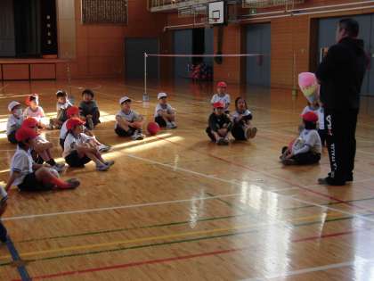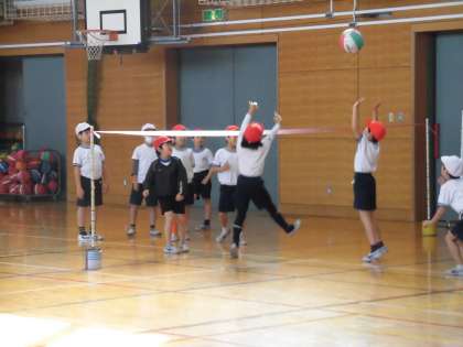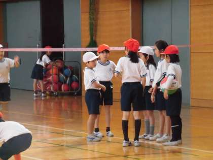 体育では、ボールゲームの学習がスタートしました。柔らかいボールや風船を袋に入れたものを使い、相手コートに投げ入れます。簡単なようで柔らかいボールなりに操作が難しいものです。